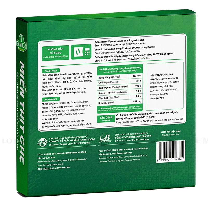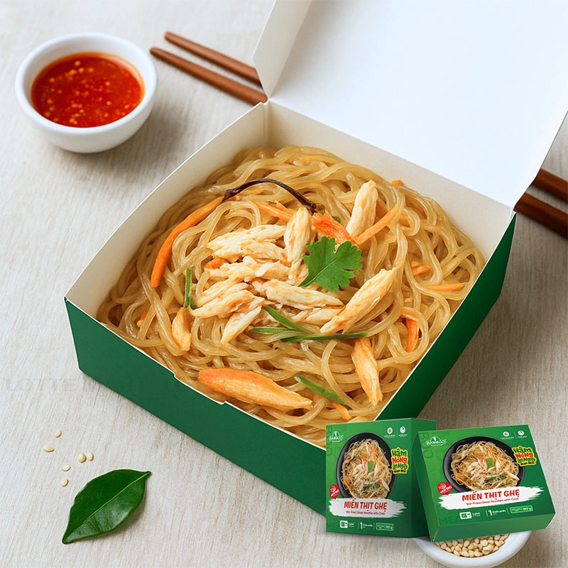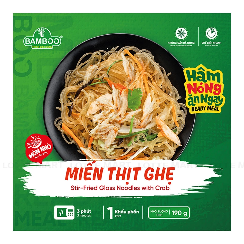 - Miến Thịt Ghẹ Bamboo được chế biến từ miến dai mềm, kết hợp cùng thịt ghẹ tươi ngon, nấm mèo giòn sần sật và các loại rau củ bổ dưỡng, tạo nên một món ăn giàu hương vị, cân bằng dinh dưỡng và đặc trưng hấp dẫn.