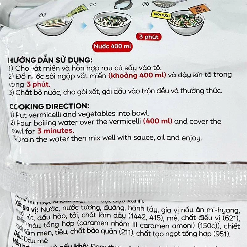 - Cho vắt miến và hỗn hợp rau củ sấy vào tô. Đổ nước sôi ngập miến (khoảng 400ml) và đậy kín tô trong vòng 3 phút. Chắt bỏ nước, cho gói xốt, gói dầu vào trộn đều và thưởng thức.