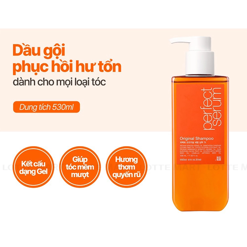 - Dầu Gội Dưỡng Tóc Mise En Scène Perfect Serum Original Chai 530ml dưỡng tóc mềm mượt hỗ trợ phục hồi tóc hư tổn. Chiết xuất từ 7 loại tinh dầu dưỡng tóc cáo cấp giúp nhanh chóng thâm nhập sâu vào tóc giúp nuôi dưỡng tóc suôn mượt, phục hồi tóc khỏe mạnh, ngăn ngừa tình trạng xơ, rối, gãy, rụng tóc hiệu quả.