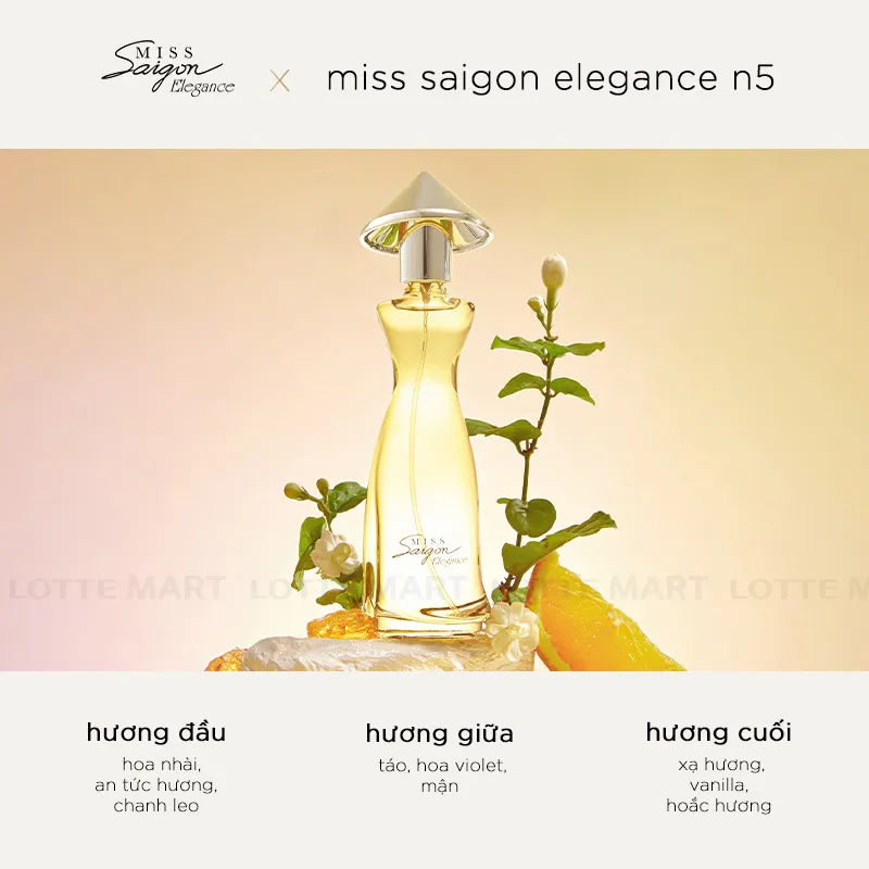 Nước Hoa Nữ Miss Saigon Elegance Amber (N5) EDP Chai 50ml tươi mát, ngọt ngào từ hương trái cây, kết hợp với hoa lài và xạ hương. Với mùi hương chủ đạo từ trái cây, cho cảm giác tươi mát, sảng khoái. Sư kết hợp nhiều tầng hương thơm luôn luôn tạo cảm giác mới mẻ cho người sử dụng. Thêm vào đó, nguồn nguyên liêu sản xuất nhập khẩu nước ngoài. Do đó sản phẩm nước hoa luôn được đảm bảo.
