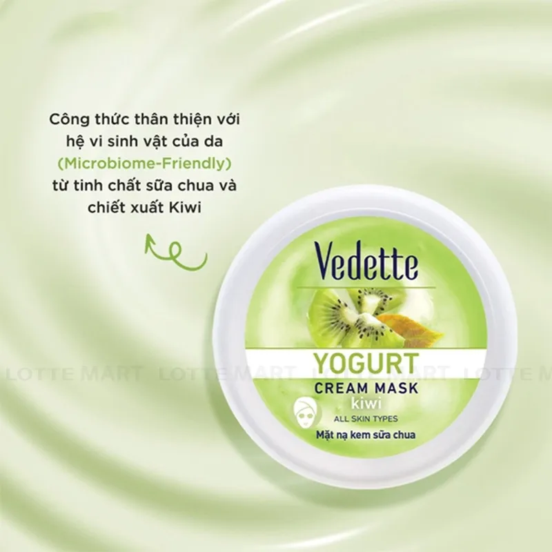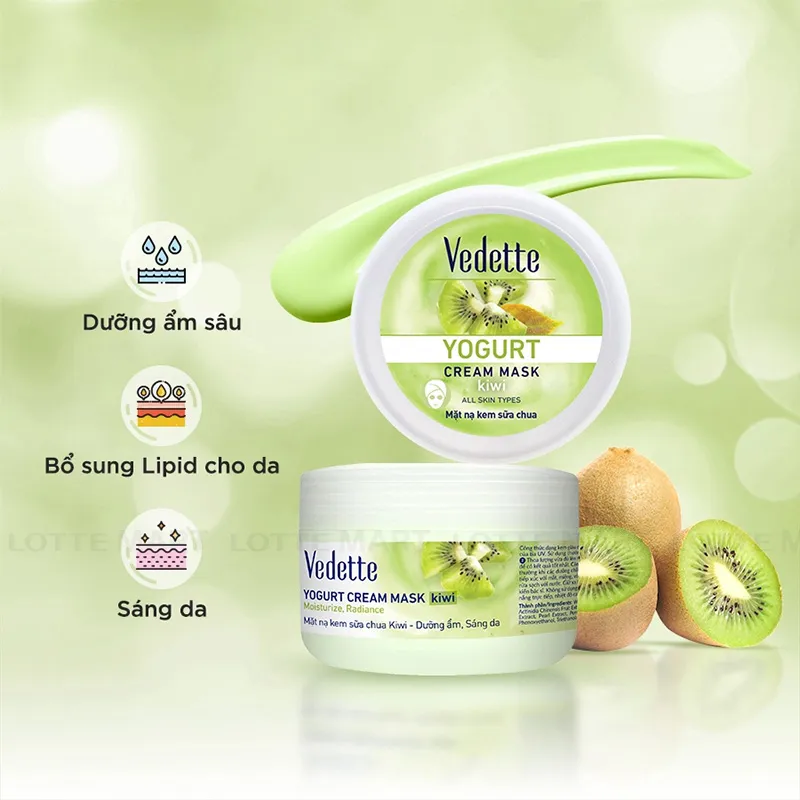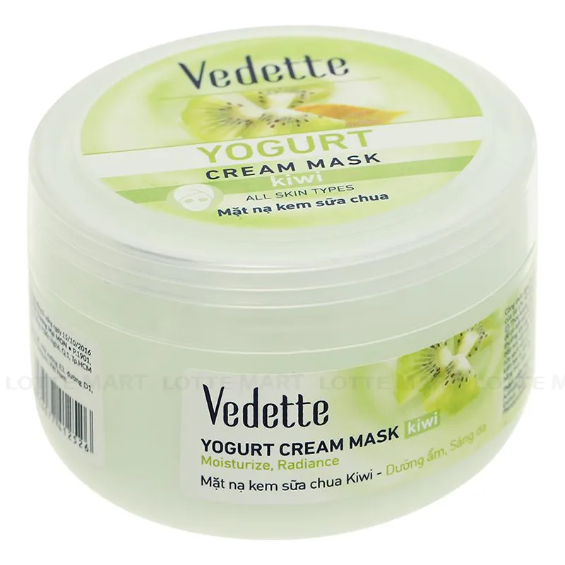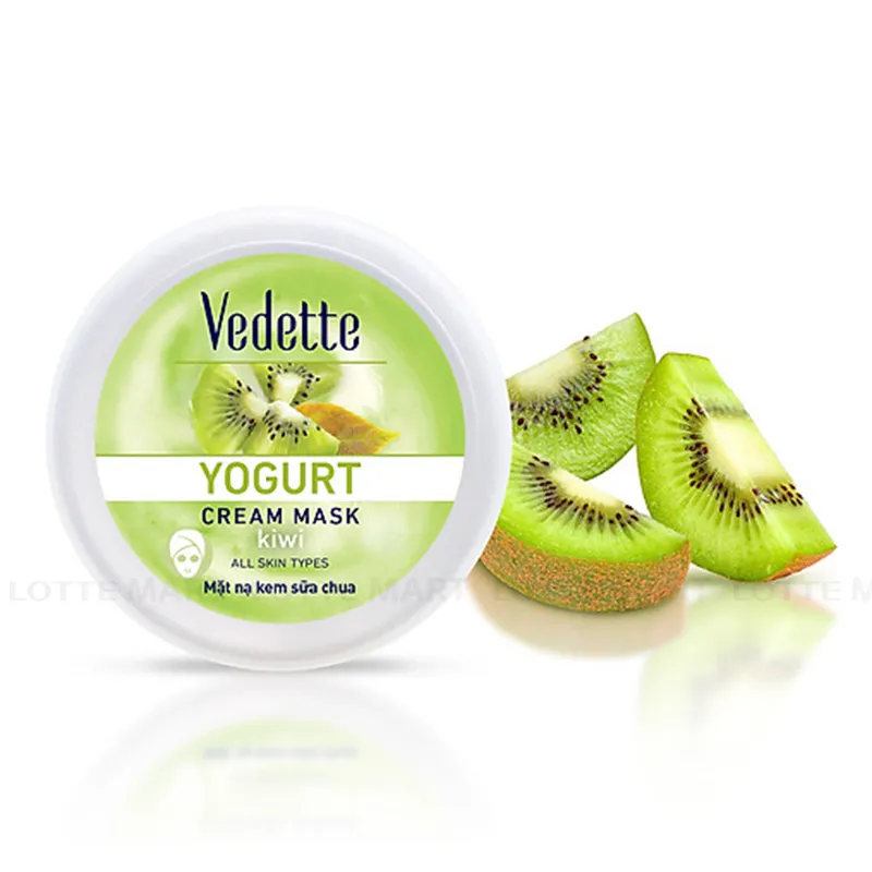 Mặt Nạ Sữa Chua Vedette Kiwi 120ml là mặt nạ sữa chua chiết xuất kiwi giàu acid trái cây, các chất khoáng vi lượng và vitamin B,C,E giúp làm sạch bề mặt da, đồng thời có tác dụng làm sáng da và làm mờ vết thâm. Kết hợp với tinh chất sữa chua chứa hàm lượng cao acid lactic và khoáng chất, cung cấp đầy đủ dưỡng chất thiết yếu, giữ ẩm và làm mịn da.