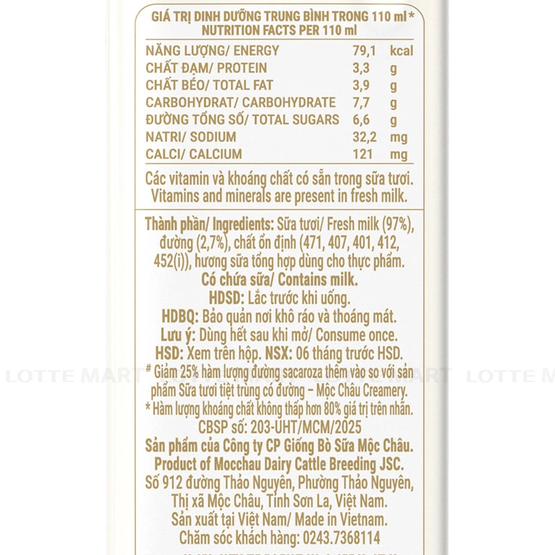 - Sữa Tươi Tiệt Trùng Ít Đường Mộc Châu Creamery mang đến hương vị tinh khiết, ngọt lành từ cao nguyên Mộc Châu, nơi những con bò sữa chất lượng cao được chăn thả trong môi trường thiên nhiên mát lành.