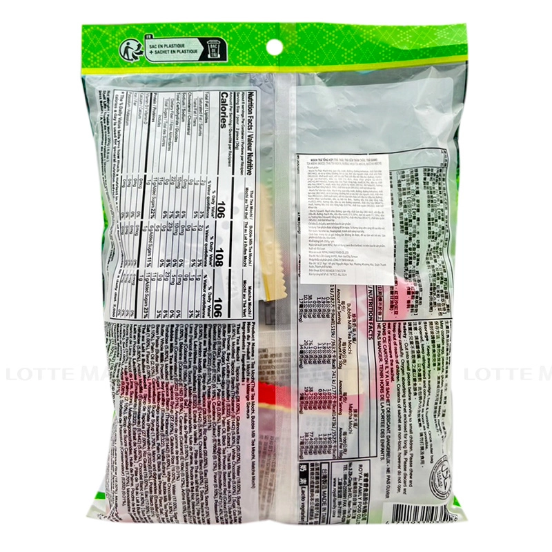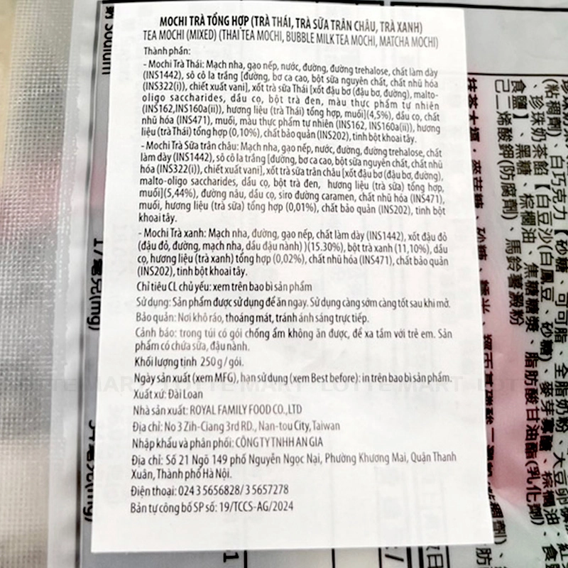 - Mochi Trà Thái: Mạch nha, Gạo Nếp, Nước, Đường, Chất làm ngọt (E950), Chất làm đặc (E1442), Sôcôla trắng (Đường, Bơ Cacao, Bột sữa nguyên chất, Chất nhũ hóa (E322) (Đậu nành), Chiết xuất vani), Bột trà Thái (Bột đậu kiếm (Đậu kiếm, Đường), Bơ (Sữa), Bột trà đen, Màu thực phẩm (E162, E160a), Gia vị trà Thái), Dầu cọ, Màu thực phẩm (E162, E160a), Gia vị trà Thái, Chất nhũ hóa (E471), Muối, Chất bảo quản (E202), Tinh bột khoai tây