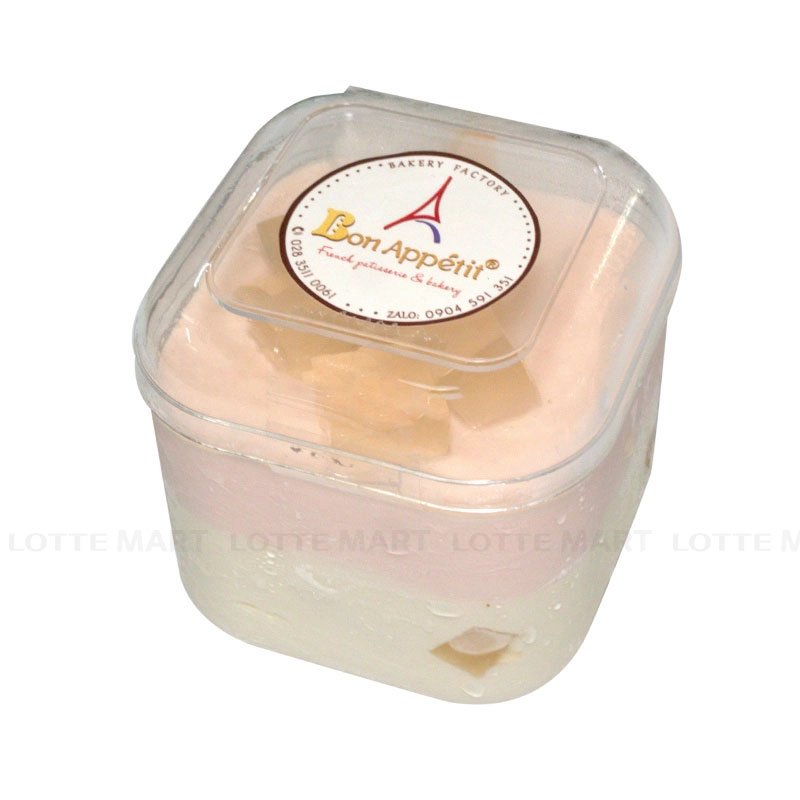 Thành phần: Cream cheese, whipping cream, gelatin, đường, trứng, sữa, topping ever-whip, 5% mứt vải hoa hồng, 10% thạch vải