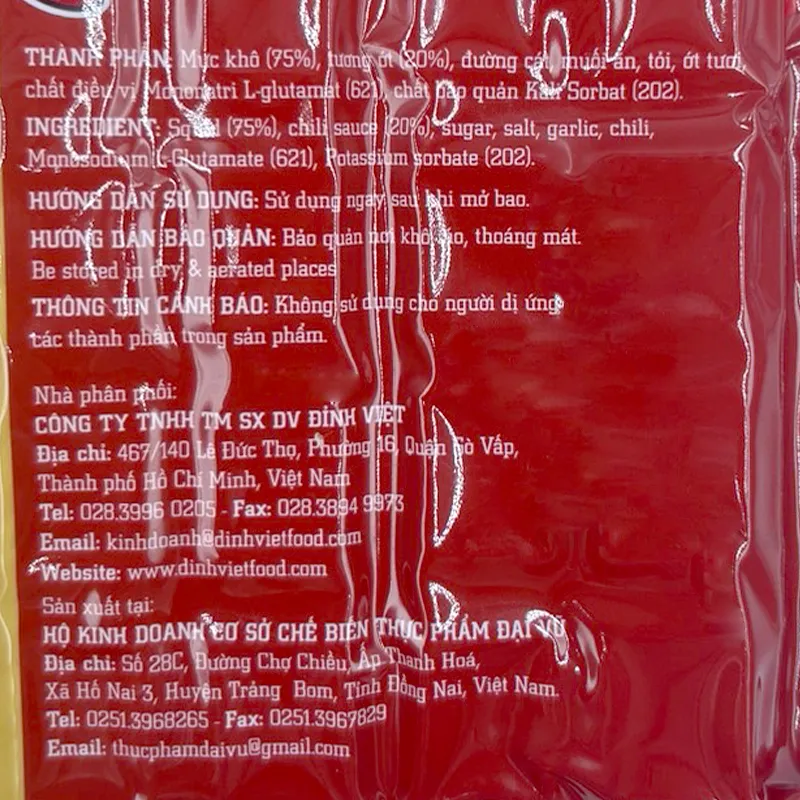 Mực nướng ăn liền Damex có thành phần chính là mực nguyên chất và các loại gia vị, tạo nên hương vị thơm ngon, hấp dẫn. Sản phẩm không chỉ hợp vệ sinh mà còn cung cấp những vi chất cần thiết cho cơ thể.