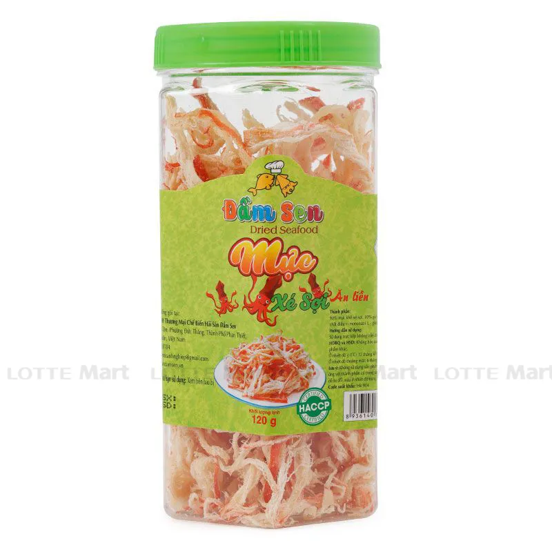 Thành phần: 90% mực khô xé sợi, 10% gia vị. Sản phẩm không sử dụng chất bảo quản. Mực Xé Sợi Ăn Liền Đầm Sen được chế biến từ mực ống hảo hạng đánh bắt tự nhiên tại vùng biển Phan Thiết, giàu đạm, canxi.... rất tốt cho sức khỏe.Sản phẩm thích hợp mang theo trong các chuyến du lịch, làm quà tặng. Dùng để uống bia, ăn với cơm, bún hoặc dùng như món ăn vặt tiện lợi.Số lượng