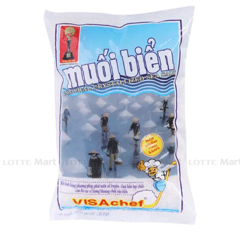 Muối Biển tự nhiên Visachef Visalco được kết tinh bằng phương pháp phơi nước cổ truyền, hoàn toàn sạch và không lẫn tạp chất, đảm bảo giữ lại vi lượng khoáng trong nước biển, đảm bảo an toàn cho sức khỏe người tiêu dùng. Thành phần: NaCal, KIO3. Công dụng: Dùng để chế biến các món ăn. Bảo quản ở nơi khô thoáng, tránh ánh nắng trực tiếp.