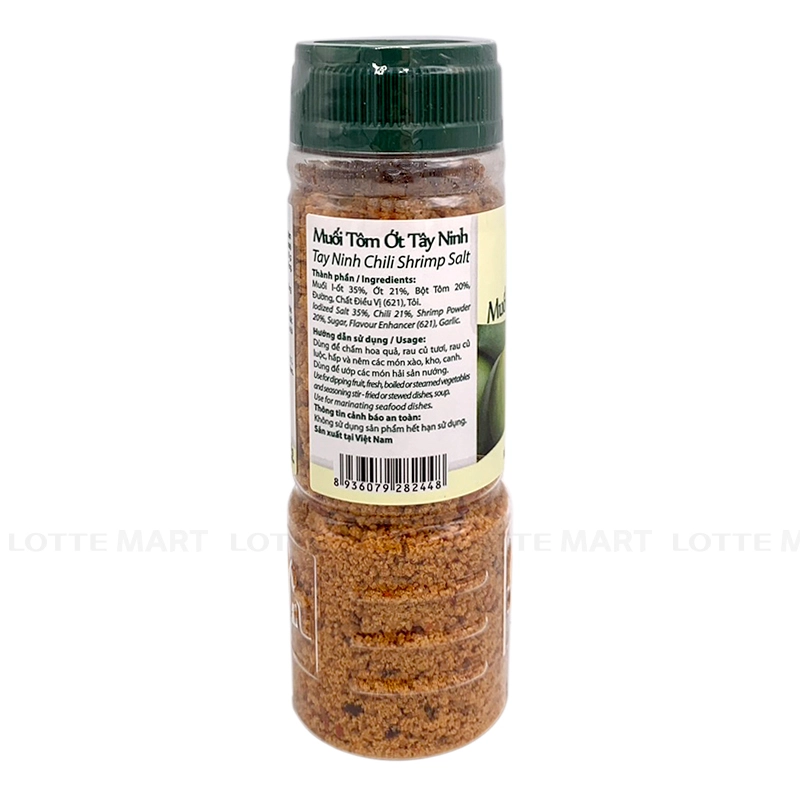 Thành phần: Muối iod (Muối, kali iodat) (40%), bột tôm (15%), ớt, tỏi, chất điều vị: Mononatri Glutamat (E621), đường.
