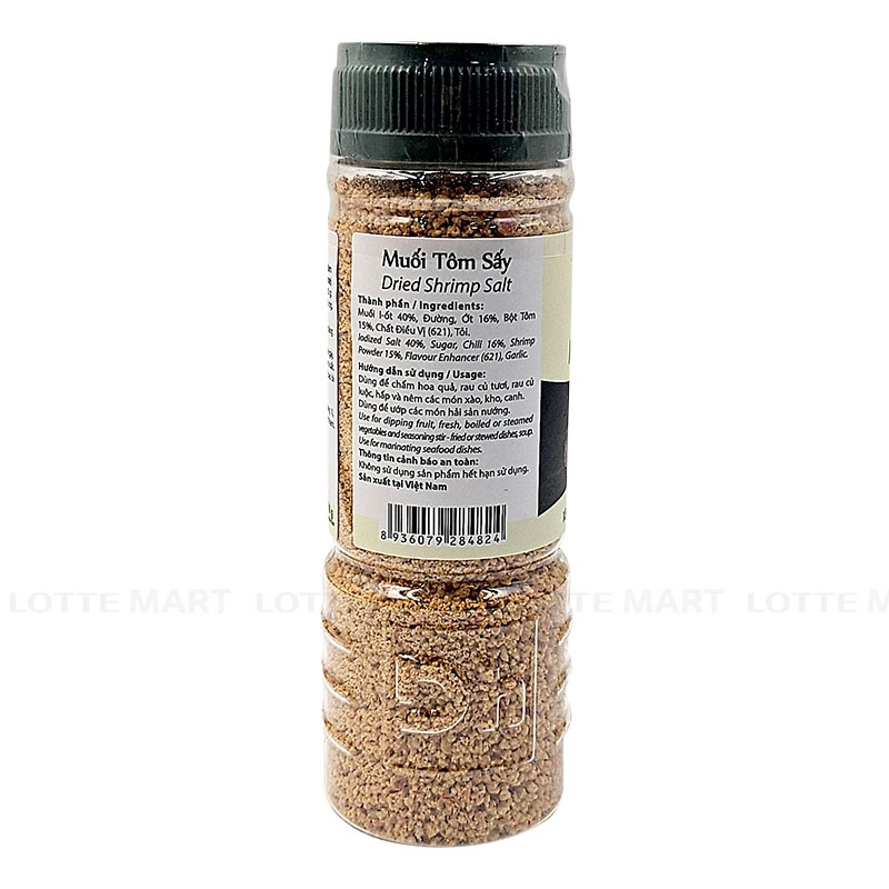 Thành phần: Muối Iod, Bột Tôm, Ớt, Tỏi, Chất điều vị (E621), Đường, Phẩm màu tự nhiên (E160c(i))..