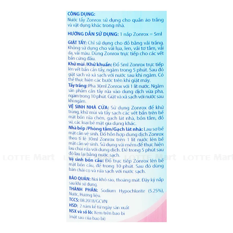 Có thể được dùng để làm sạch các vết ố bẩn, khi ngâm, giặt và diệt sạch vi khuẩn, Zonrox loại bỏ các vết ố bẩn ngoan cố và bụi dơ ra khỏi quần áo và sớ vải.