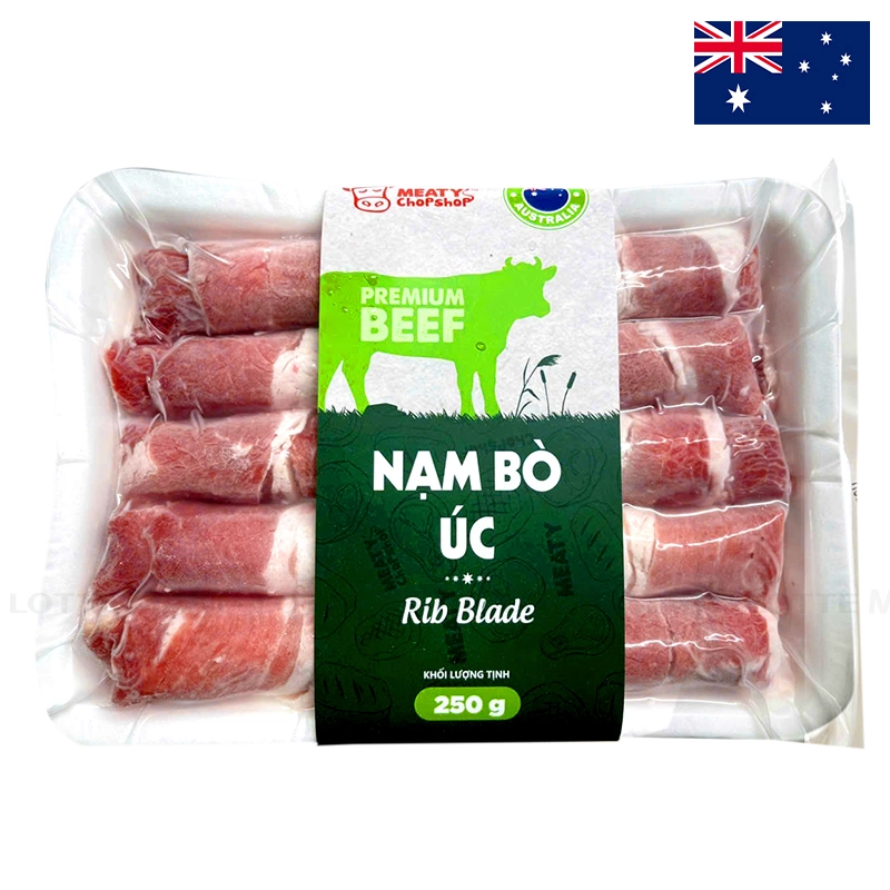 Nạm Bò Meaty Chopshop được thái lát mỏng và đóng trong khay xốp, bọc màng co, khi ăn chỉ cần rã đông và sử dụng.