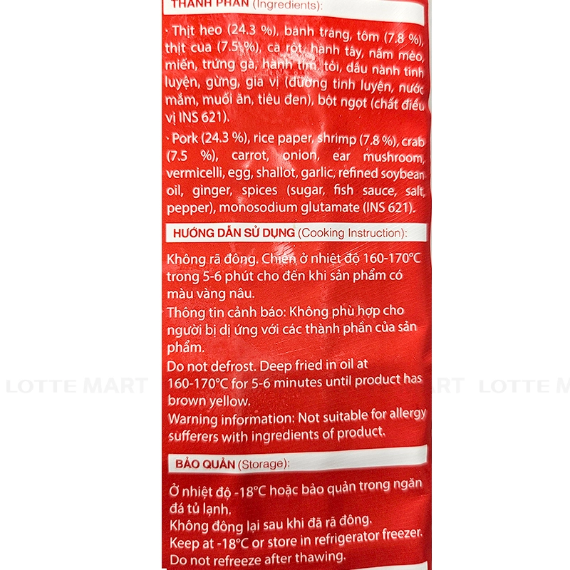 - Thịt heo 24.3%, bánh tráng, tôm 7.8%, thịt cua 7.5%, cà rốt, hành tây, nấm mèo, miến, trứng gà, hành tím, tỏi, dầu nành tinh luyện, gừng, gia vị (đường tinh luyện, nước mắm, muối ăn, tiêu đen), chất điều vị (INS 621).