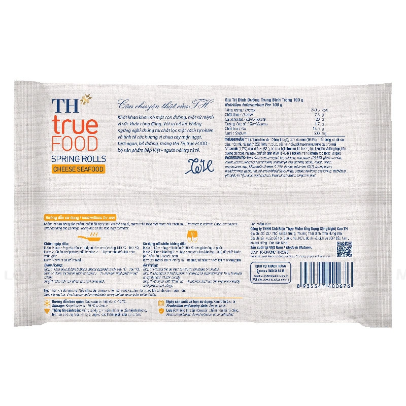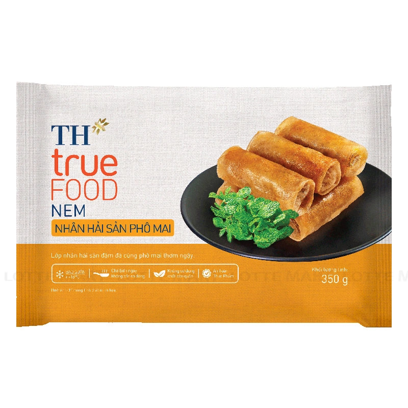 - Nem Nhân Hải Sản Phô Mai TH true FOOD là sự kết hợp hài hòa giữa hải sản tươi ngon và lớp phô mai béo mịn, được cuốn trong lớp bánh đa mỏng và chiên vàng giòn hấp dẫn.