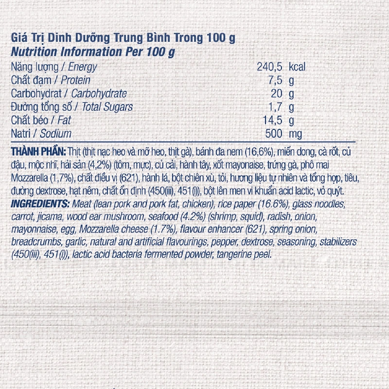- Thịt (thịt nạc heo và mỡ heo, thịt gà), bánh đa nem (16.6%), miến dong, cà rốt, củ đậu, mộc nhĩ, hải sản (4.2%) (tôm, mực), củ cải, hành tây, xốt mayonaise, trứng gà, phô mai Mozzarella (1.7%), chất điều vị (621), hành lá, bột chiên xù, tỏi, hương liệu tự nhiên và tổng hợp, tiêu, đường dextrose, hạt nêm, chất ổn định (450(iii), 45(i)), bột lên men vi khuẩn acid lactic, vỏ quýt.