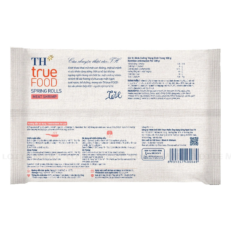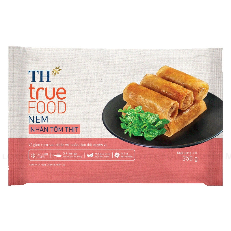 - Nem Nhân Tôm Thịt TH true FOOD là sự kết hợp giữa phần nhân tôm tươi ngọt và thịt heo mềm, cuộn trong lớp bánh đa nem mỏng và chiên giòn vàng đều.