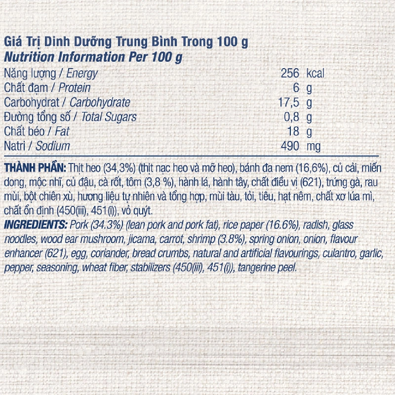 - Thịt heo (34.3%) (thịt nạc heo và mỡ heo), bánh đa nem (16.6%), củ cải, miến dong, mộc nhĩ, củ đậu, cà rốt, tôm (3,8%), hành lá, hành tây, chất điều vị (621), trứng gà, rau mùi, bột chiên xù, hương liệu tự nhiên và tổng hợp, mùi tàu, tỏi, tiêu, hạt nêm, chất xơ lúa mì, chất ổn định (450(iii), 451(i)), vỏ quýt.