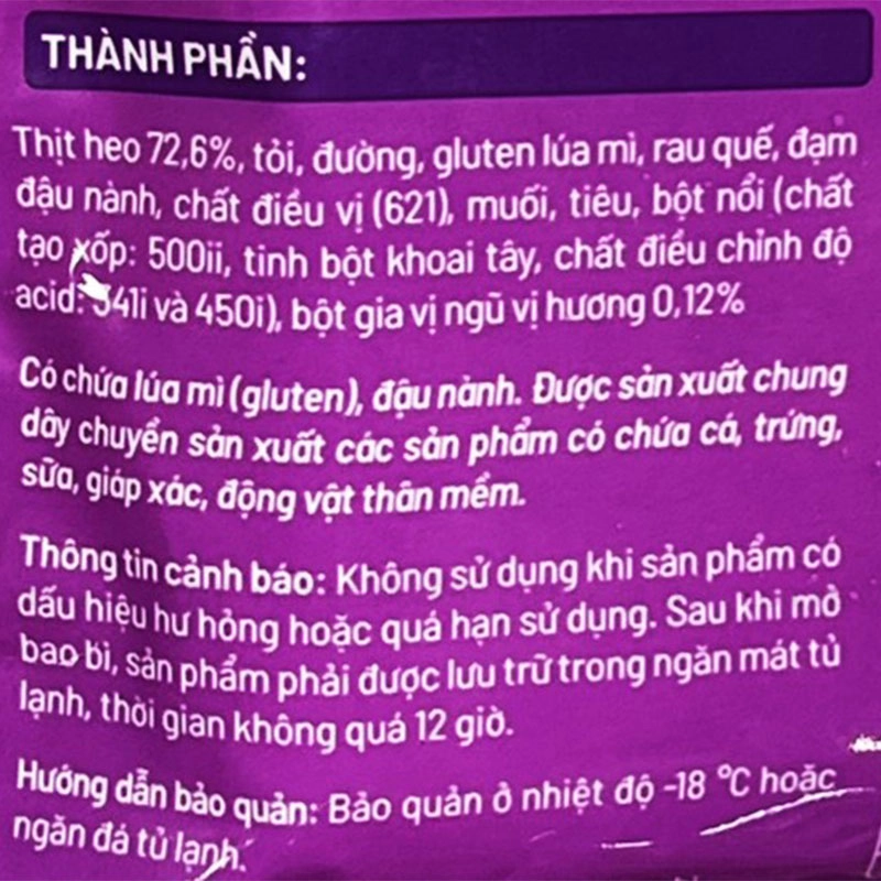 Thành phần: Nạc heo, đường, gluten, lá quế, muối, chất điều vị, tỏi, tiêu, ngũ vị hương, chất bảo quản.