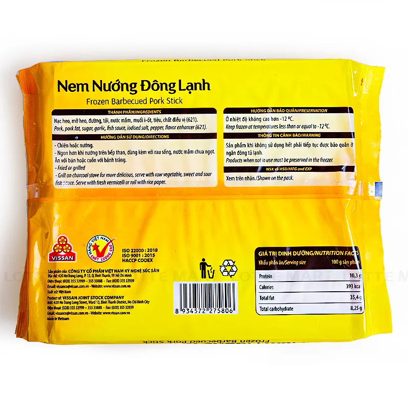 Nem Nướng Đông Lạnh Vissan là sản phẩm được làm từ thịt heo, mỡ heo kết hợp với các gia vị tạo nên món ăn thơm ngon, hấp dẫn, không chứa hóa chất bảo quản, chất phụ gia ảnh hưởng đến sức khỏe người tiêu dùng.