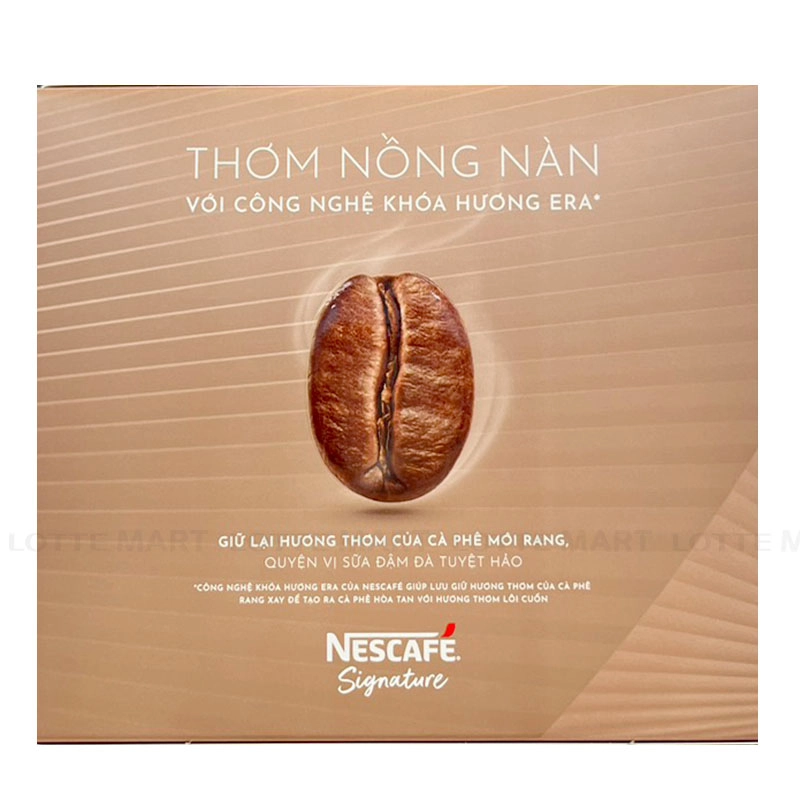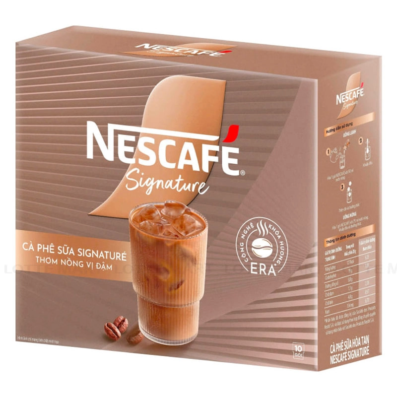 Cà Phê Sữa Hòa Tan NesCafé Signature với thành phần chế biến từ cà phê hòa tan nguyên chất, mang đến hương vị cà phê rang xay đặc trưng, mạnh mẽ, phù hợp với những ai yêu thích vị cà phê đậm.
