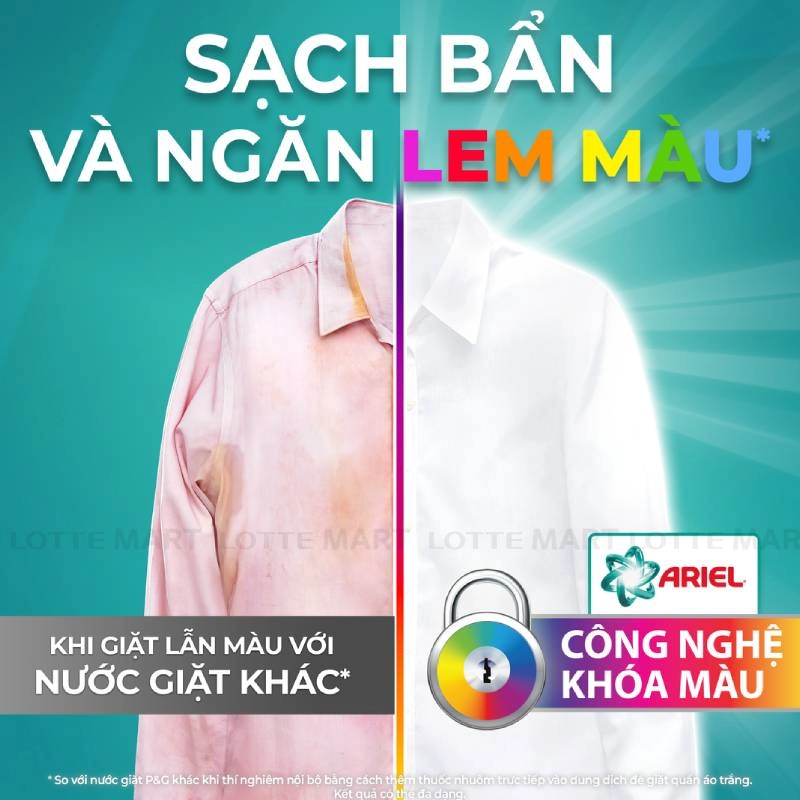 - Công thức làm sạch ARIEL 3D đánh bay vết bẩn Nước giặt ARIEL MATIC cửa trước không cần chất tẩy nhưng vẫn đảm bảo làm sạch vải do có công thức 3D thấm sâu vào từng sợi vải và bẻ nhỏ mọi vết bẩn, thay vì tẩy trắng vết bẩn như công thức của các sản phẩm giặt thông thường.