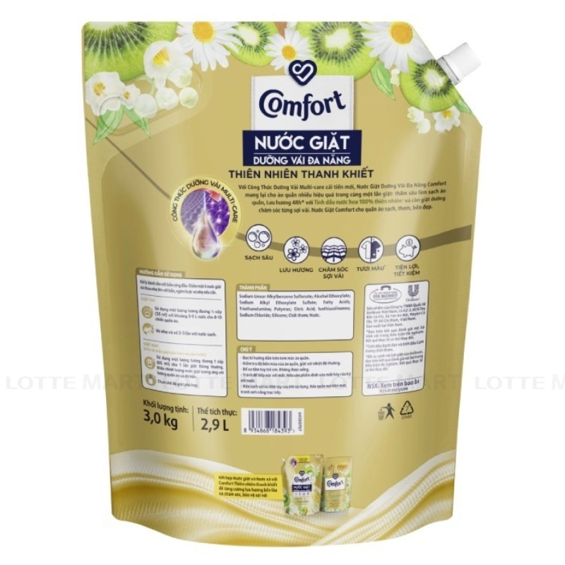 Với Công Thức Dưỡng Vải Multi-care cải tiến mới, Nước Giặt Comfort Dưỡng Vải Đa Năng Thiên Nhiên Thanh Khiết mang lại cho áo quần nhiều hiệu quả trong cùng một lần giặt, thấm sâu làm sạch áo quần, lưu hương 48h với tinh dầu nước hoa 100% thiên nhiên và thấm sâu, chăm sóc trong từng sợi vải. Nước giặt Comfort cho quần áo sạch, thơm, bền đẹp.