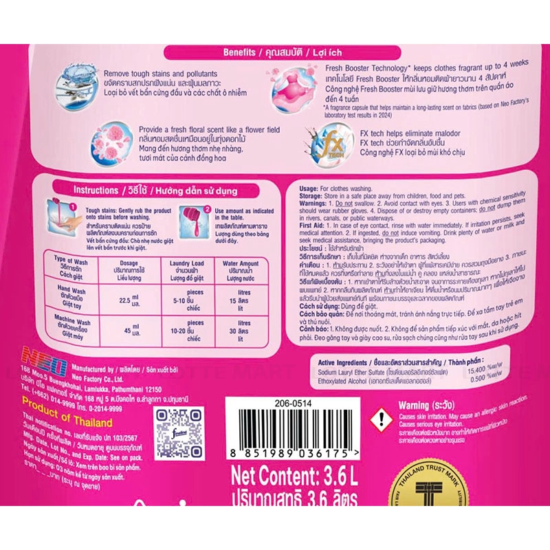 - Nước khử Ion, hương hoa (Floral), hương trái cây, Sodium Lauryl Ether Sulfate, Ethoxylated Alcohol, Sodium Polyacrylate, Sodium Chloride, hỗn hợp Protease, Alpha - Amylase, Cellulase và Mannanase, hỗn hợp 5-Chloro-2-Methyl-2h-Isothiazole-3-One và 2-Methyl-2h- Isothiazole-3-One và 2-Bromo-2- Nitropropane-1, 3-Diol, CI 17200.