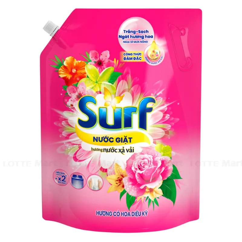 - Nước Giặt Surf Hương Hoa Cỏ Diệu Kỳ với công thức tối ưu hóa cùng với lượng thành phần hoạt tính cao, giúp mang lại kết quả đột phá, đánh tan nhanh chóng những vết bẩn cứng đầu dính trên áo quần.