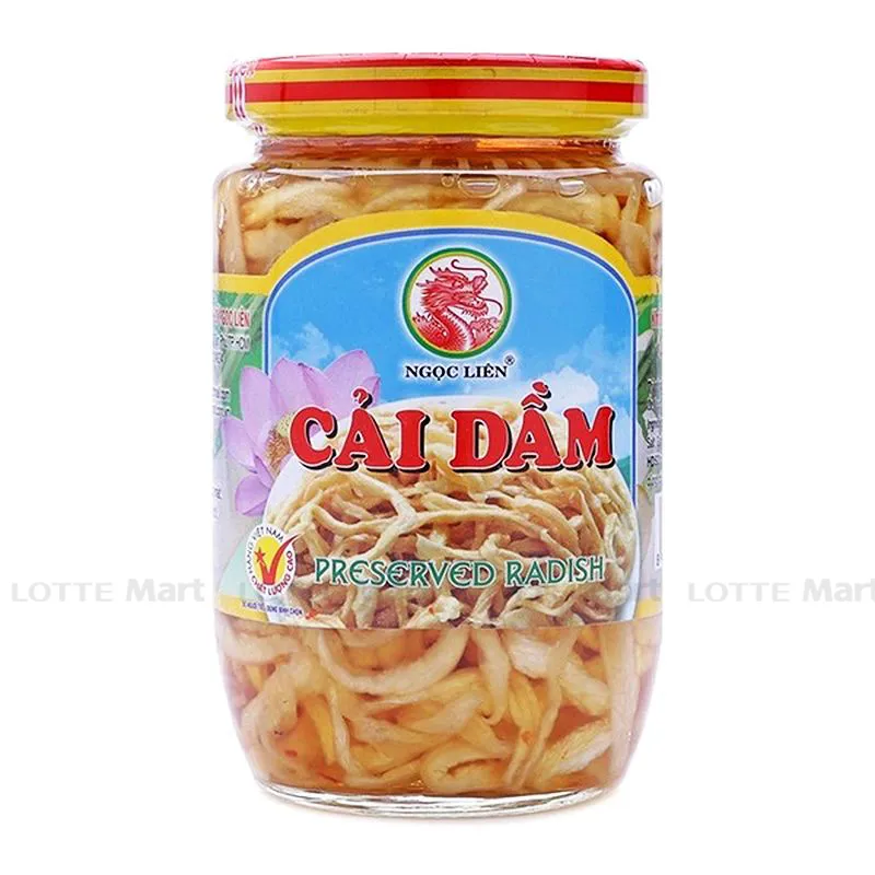 Cải Dầm Ngọc Liên Hũ 430g với thành phần chính là củ cải trắng khô, kết hợp cùng các loại nguyên liệu và gia vị hảo hạng. Sản phẩm được sản xuất theo công thức truyền thống giúp giữ nguyên hương vị thơm ngon, tự nhiên. Sản phẩm có hương vị thơm ngon đặc trưng của tỏi ớt hòa quyện trong từng miếng cải giòn giòn, tạo cảm giác ngon miệng khi thưởng thức. Sản phẩm dùng ngon hơn khi ăn chung với bánh tét, bánh chưng hoặc cơm nóng. Sản phẩm mang nhãn hiệu Ngọc Liên, không có chứa hóa chất bảo quản độc hại, đảm bảo an toàn cho sức khỏe người dùng. Hơn nữa, cải dầm được đóng hũ thủy tinh kín hơi, tiện lợi để bảo quản và sử dụng. Hướng dẫn sử dụng: Sản phẩm ăn liền, ngon hơn khi ăn kèm thịt nguội, bánh chưng, giò xào và thịt đông, cơm. Bảo quản: Bảo quản nơi thoáng mát, tránh ánh nắng mặt trời, để tủ lạnh sau khi mở nắp, sử dụng trong vòng 1 tháng sau khi mở nắp.