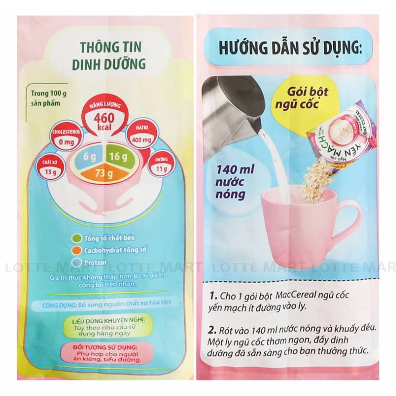 Hướng dẫn sử dụng: Cho 1 gói ngũ cốc vào ly, rót 140ml nước nóng, khuấy đều và thưởng thức.