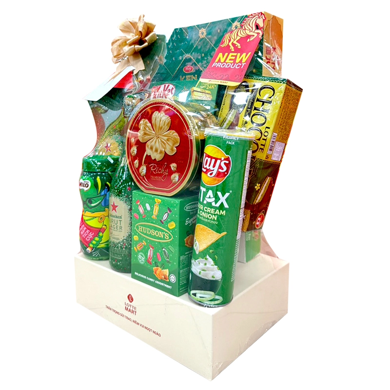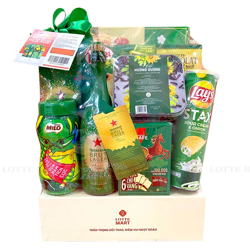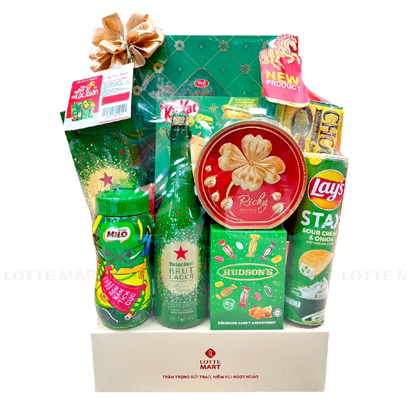 Giỏ quà bao gồm 10 sản phẩm đa dạng là Bia Heineken Brut Lager 5% ABV Chai 750ml, Thức Uống Lúa Mạch Milo Hũ 400G, Bánh Quy Kenju Rau Củ Hộp 360G, Bánh Socola Pie LOTTE CHOCOLAT Vị Trà Xanh Hộp 169.8G, Socola KitKat Trà Xanh Hộp 136G, Bánh Quy AFC Vị Rau Hộp 172G, Snack Khoai Tây Lays Stax Vị Kem Chua Hành Hộp 150G, Kẹo Ngậm Hudson's Eumenthol Drops Ngũ Vị Hộp 100G, Bánh Quy Richy Lộc Vàng Hộp 156G hoặc Hạt Hướng Dương H'ren Thái Việt Phúc Hộp 200G và Bánh Orion Custas Kem Trứng Hộp 46G.