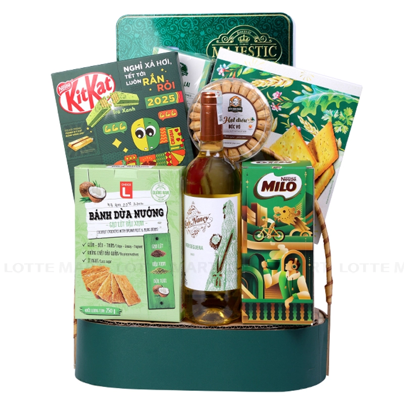 Với tông xanh lá chủ đạo, giỏ quà mang lại cảm giác trẻ trung và năng động, phù hợp với các gia đình hiện đại. Sự kết hợp giữa bia Lager, Milo và các loại bánh kẹo, snack được yêu thích mang đến sự phong phú và tiện lợi cho mọi lứa tuổi trong dịp sum họp.