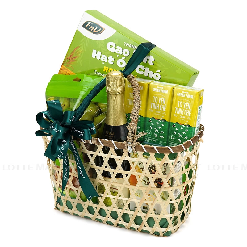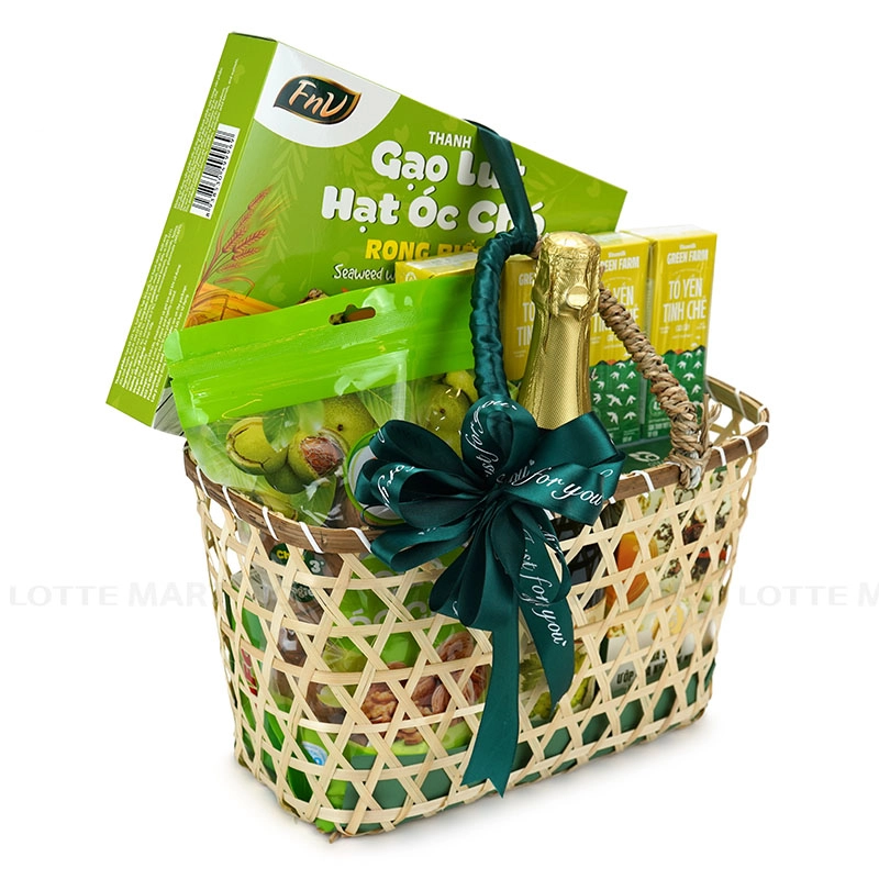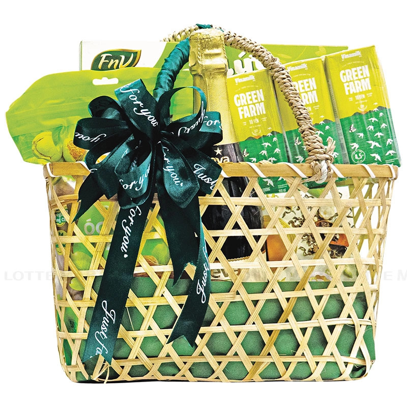 Đặc biệt, giỏ quà được trang trí bằng điểm nhấn bởi ruy băng xanh mát không chỉ đẹp mắt mà còn rất thiết thực, là lựa chọn tuyệt vời để trao tặng sự quan tâm chân thành dịp đầu Xuân.