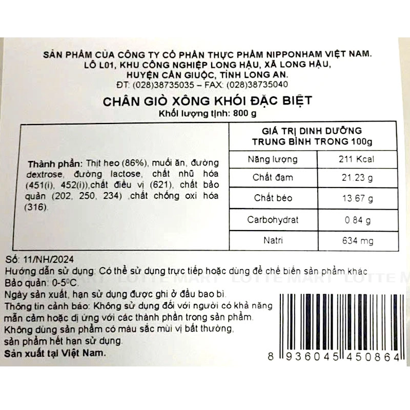 - Chân Giò Xông Khói Đặc Biệt Nipponham là sản phẩm dành cho những ai yêu thích hương vị thịt ngon đậm đà. Mỗi chiếc chân giò được rút xương cẩn thận, sau đó tẩm ướp các loại gia vị đặc trưng và nhồi lại nguyên vẹn, tạo nên độ mềm mọng và trọn vẹn về hình dáng.