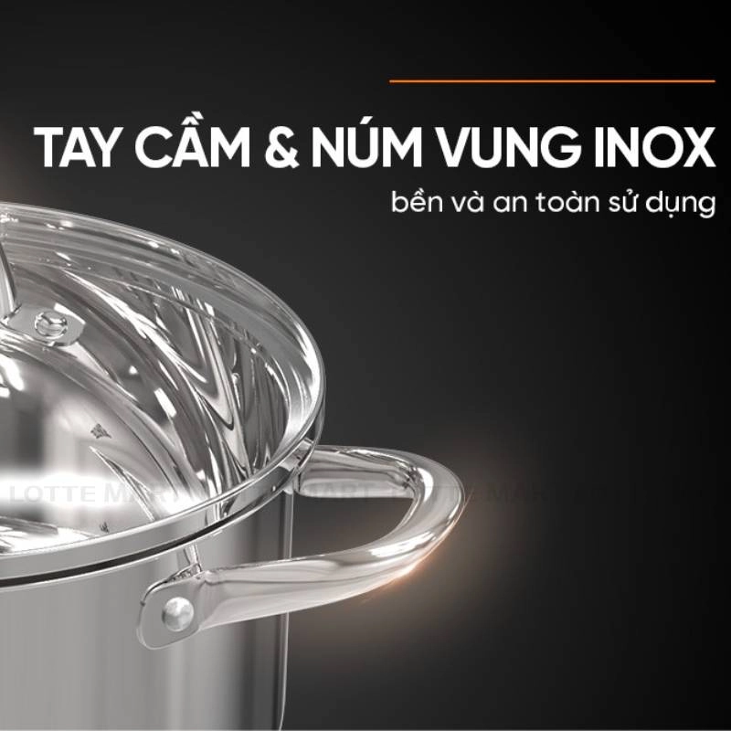 Tay cầm và núm vung được làm từ inox chắc chắn, thiết kế rỗng giúp hạn chế nhiệt độ cao, dễ dàng cầm nắm mà không bị bỏng.