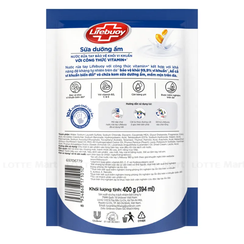 Nước Rửa Tay Lifebuoy Công Thức Vitamin+ Sữa Dưỡng Ẩm Túi 400G