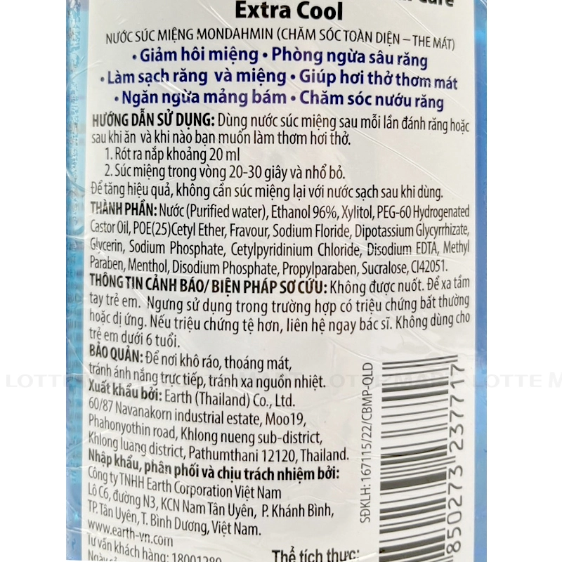 - Nước Súc Miệng Mondahmin Total Care Extra Cool thuộc thương hiệu của Nhật Bản, được phát triển dựa trên công thức kết hợp hoàn hảo các thành phần giúp bạn vệ sinh răng miệng mỗi ngày, bảo vệ sức khỏe răng miệng cả gia đình một cách toàn diện với hương vị độc đáo riêng biệt, sảng khoái, sạch sẽ.
