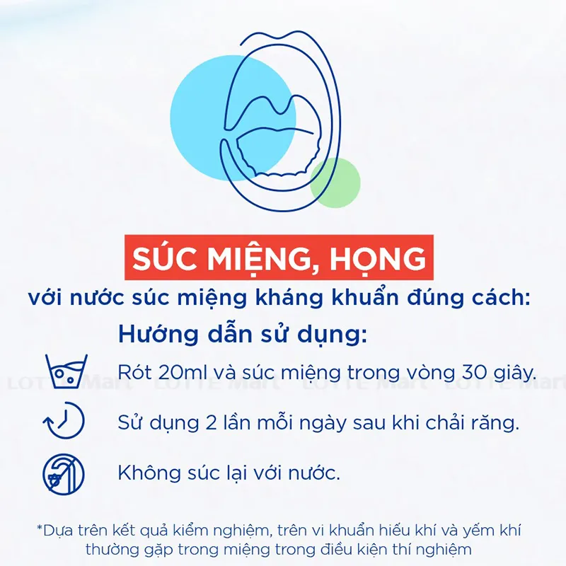 Hướng dẫn sử dụng: Đổ nước súc miệng vào nắp đến vạch 20ml, súc miệng trong 30 giây. Dùng 2 lần mỗi ngày sau khi chải răng Không dùng cho trẻ em dưới 6 tuổi, tránh xa tầm tay của trẻ em. Không pha loãng và không được uống, không súc lại bằng nước sau khi sử dụng. Bảo quản: Nơi khô ráo thoáng mát. Tránh ánh nắng trực tiếp, nơi có nhiệt độ cao hoặc ẩm ướt. Đậy nắp kín sau khi sử dụng. Xuất xứ: Việt Nam.