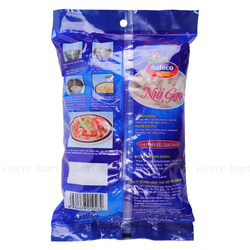 Nui Gạo Hảo Hạng Safoco được làm từ các nguyên liệu tự nhiên, không chất bảo quản độc hại, mang đến sự an tâm cho người tiêu dùng. Sản phẩm là sự kết hợp độc đáo giữa công thức truyền thống và quy trình chế biến hiện đại đem lại chất lượng nổi bật.