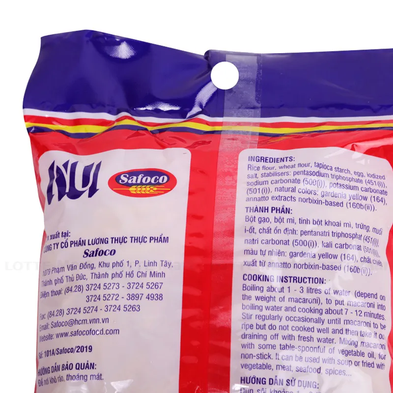 Nui Ống Safoco với thành phần chính từ bột gạo và bột mì, cọng nui có màu vàng ươm và hình dạng xoắn đẹp mắt.