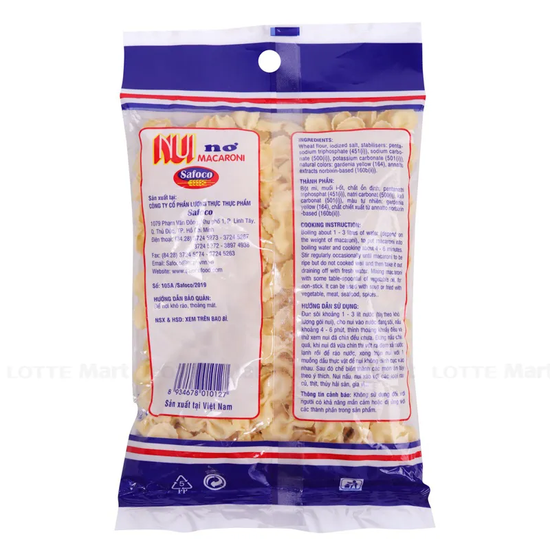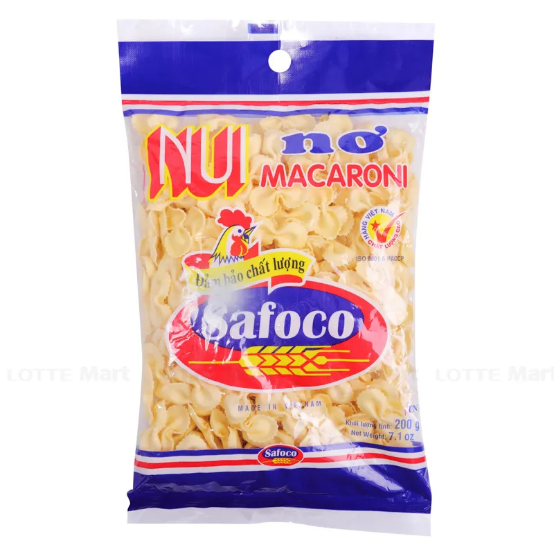 Nui Nơ Tròn Nhỏ Safoco Gói 200G được làm từ các nguyên liệu tự nhiên, không chất bảo quản độc hại, mang đến sự an tâm cho người tiêu dùng. Sản phẩm là sự kết hợp độc đáo giữa công thức truyền thống và quy trình chế biến hiện đại đem lại chất lượng nổi bật. Thành phần: Bột mì 98%, trứng (1%, đã qua kiểm dịch), muối ăn...Hướng dẫn sử dụng: Cho số lượng nui muốn ăn vào nước đang sôi, nấu khoảng 3 - 4 phút. Thỉnh thoảng đánh tơi nui cho chín mềm, vớt nui ra, bỏ vào nước lạnh. Đánh tơi nui rồi vớt ra để ráo nước, trộn một muỗng dầu thực vật để nui không dính vào nhau. Xào, nấu nui tùy theo sở thích ăn của mỗi người. Hướng dẫn bảo quản: Bảo quản nơi khô ráo, thoáng mát.