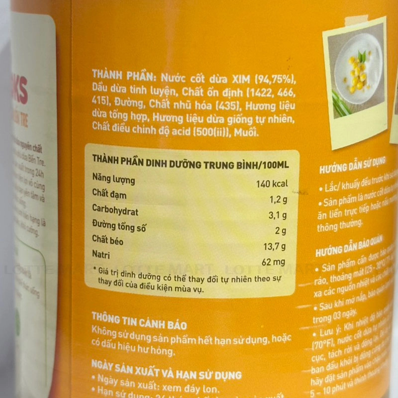 Hướng dẫn sử dụng: Lắc đều trước khi sử dụng. Sản phẩm là nước cốt dừa tự nhiên, có thể ăn liền trực tiếp hoặc nấu nướng, pha chế thông thường. Khi nhiệt độ bảo quân dưới 21°C (70°F), nước cốt dừa tự nhiên có thể bị vón cục, tách rời và đông lại. Để lấy lại kết cấu ban đầu khỏi bị đông cứng do nhiệt độ lạnh, hãy đặt sản phẩm vào chậu nước nóng trong 5-10 phút và thính thoảng khuấy.