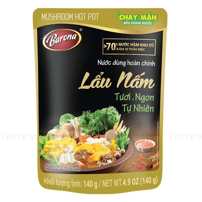 - Nước Dùng Hoàn Chỉnh Barona Lẩu Nấm là lựa chọn tuyệt vời để tạo ra nồi lẩu nấm thơm ngon, đậm đà hương vị. Với công thức đặc biệt, sản phẩm mang đến sự hòa quyện hoàn hảo giữa các gia vị, tạo nên nước lẩu đậm đà, thơm phức, kích thích vị giác.