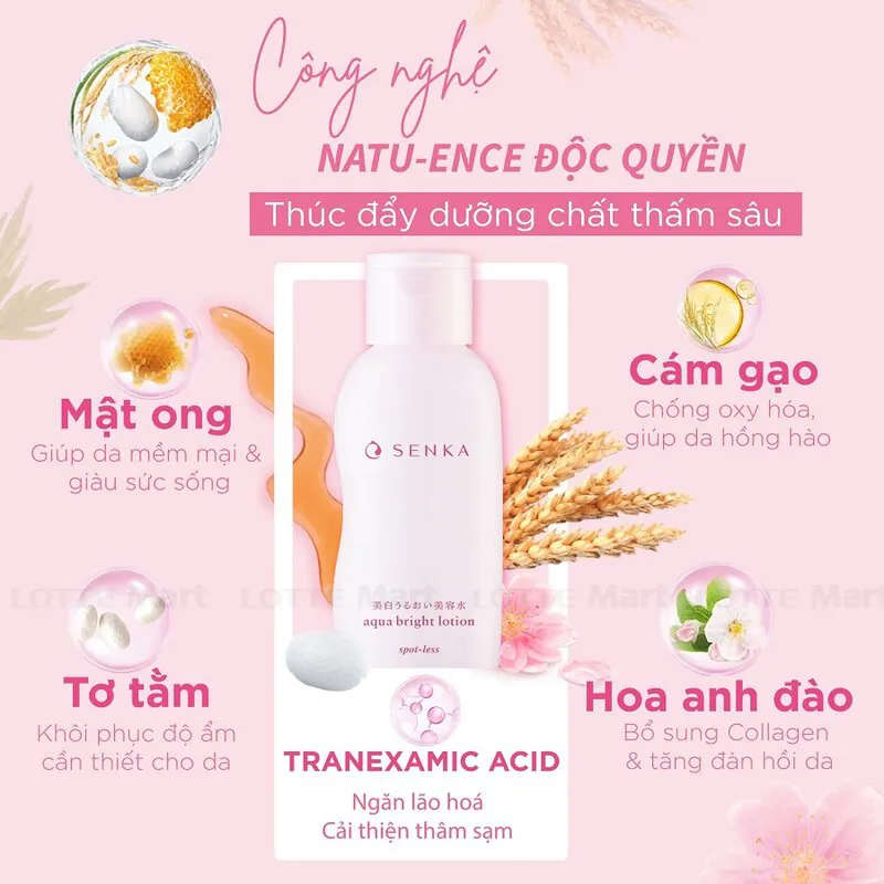 Nước Cân Bằng Senka Aqua Bright Dưỡng Sáng Mờ Thâm Sạm Chai 200ml là sản phẩm lotion chăm sóc da hàng ngày đến từ thương hiệu mỹ phẩm Senka thuộc tập đoàn ShiseidoNhật Bản, giúp nuôi dưỡng làn da đủ ẩm, sáng mịn, giúp giảm thâm nám, sạm màu và tàn nhang trên da. Sản phẩm ứng dụng công nghệ "Natu-ence" độc quyền từ Shiseido giúp nâng cao hiệu quả của các thành phần dưỡng da tự nhiên từ Nhật Bản bao gồm: chiết xuất từ các thành phần làm sáng da Tinh chất Hoa Anh Đào, Tơ Tằm Trắng, Cám Gạo, Mật Ong và gấp đôi Hyaluronic Acid giúp da sáng mịn, trong mướt.