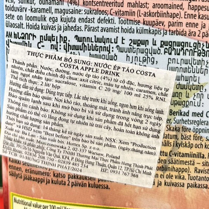 - Nước, đường, nước ép táo (4%) từ cô đặc, hương liệu, chất điều chỉnh độ axit - Axit xitric, màu - Caramel, chất tạo ngọt: Acesulfame K, Sucralose, Saccharin, Vitamin C (Axit L-Ascorbic)