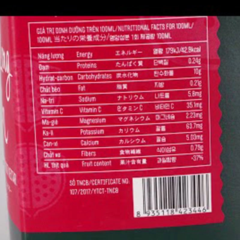 Thành phần: Quả ổi 25%, nước, thanh long 5.4%, củ dền 4%, chanh 2.5%, sơri 2%, đường mía.