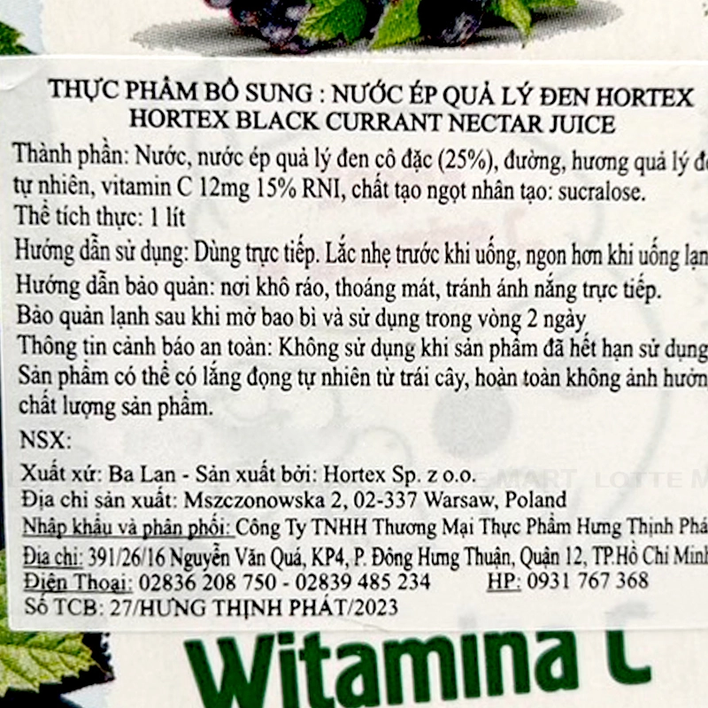 - Nước Ép Quả Lý Đen Hortex được đóng gói trong hộp tiện dụng, với tỷ lệ nước ép cherry lên tới 25%, sản phẩm này đảm bảo hương vị tự nhiên và dinh dưỡng của trái cây.