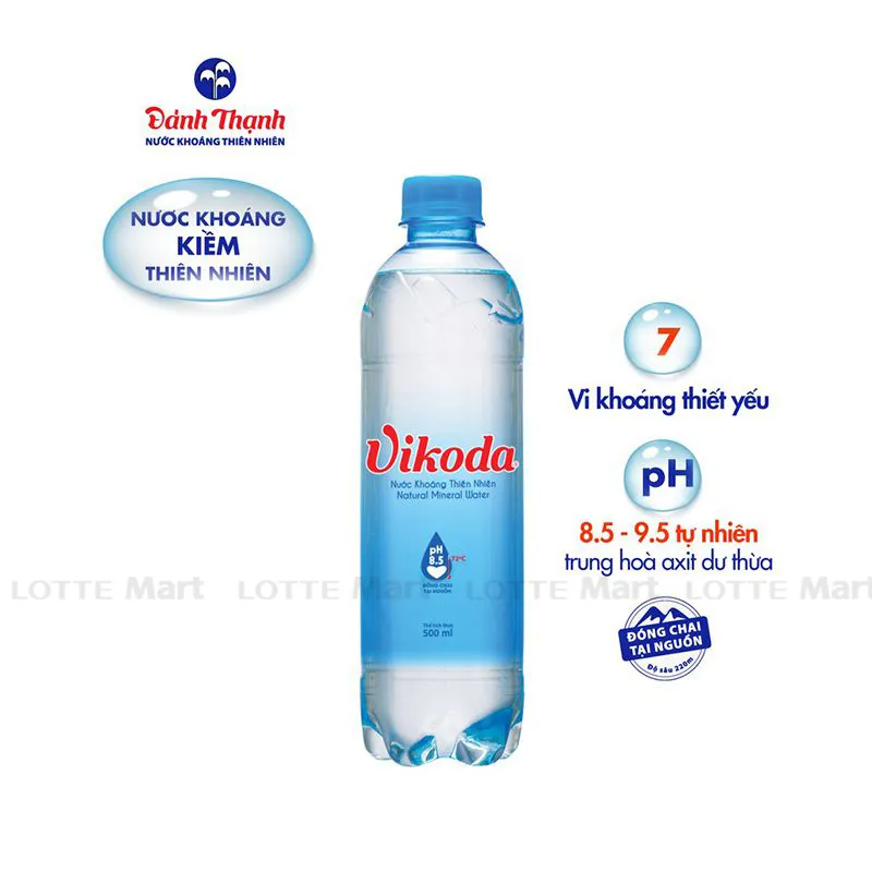 Nước khoáng thiên nhiên Vikoda chai 500ml có thành phần 100% nước khoáng kiềm thiên nhiên pH 8.5-9.5. Kiềm giúp loại bỏ axit dư thừa trong cơ thể, với vị khoáng thiên nhiên ngọt dịu trong lành, đưa cơ thể về trạng thái cân bằng.