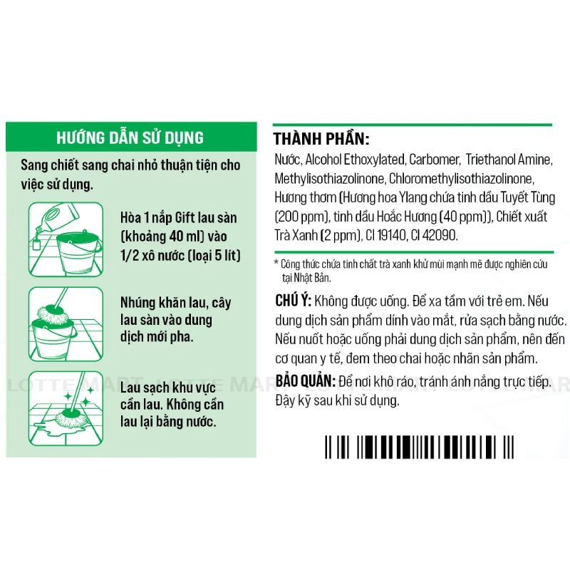 Hướng dẫn sử dụng: Pha loãng với nước và lau sàn.
