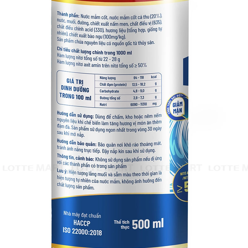 - Nước mắm cốt, nước mắm cốt cá thu (20%), nước, muối, đường, chiết xuất nấm men, chất điều vị (635), chất điều chỉnh acid (330), hương liệu (tổng hợp, giống tự nhiên), chiết xuất bào ngư (100 mg/kg).