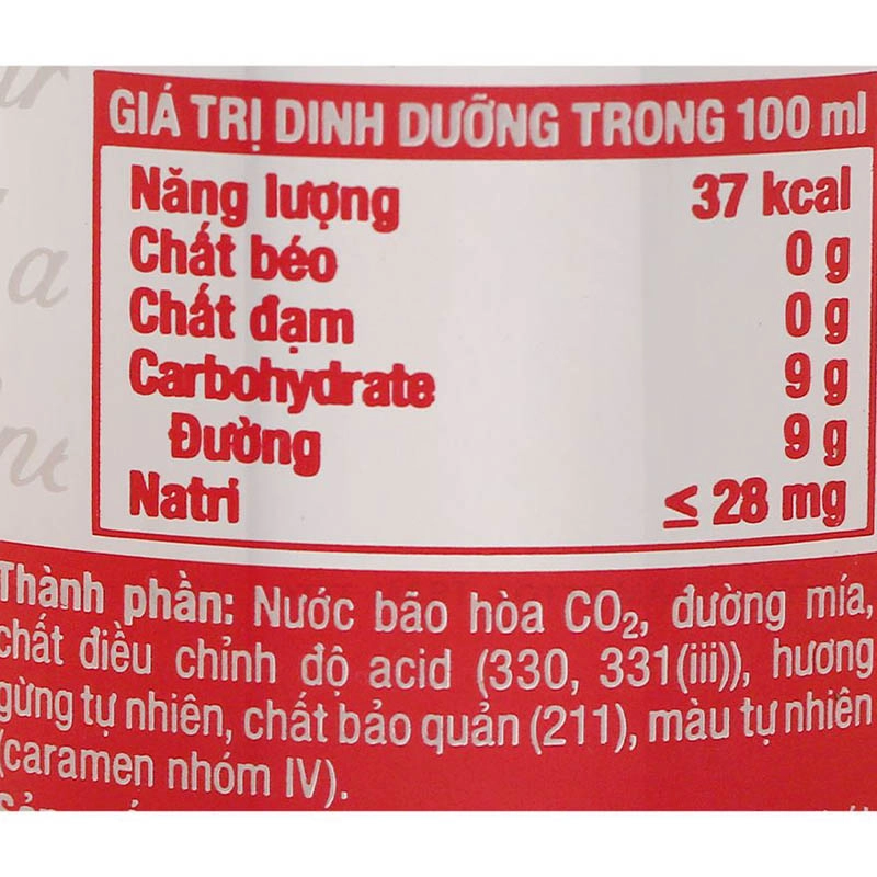 - Nước bão hòa CO2, đường mía, chất điều chỉnh độ acid (330, 331), hương gừng tự nhiên, chất bảo quản (211), màu tự nhiên (caramen nhóm IV).